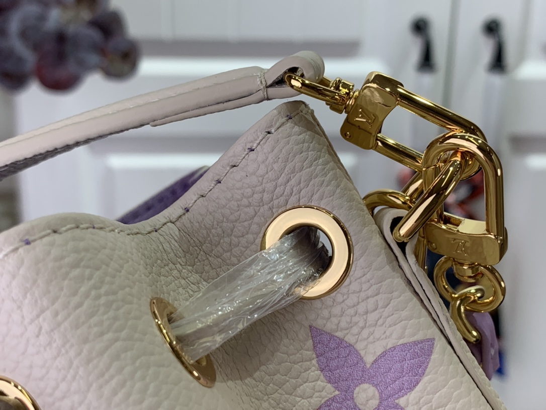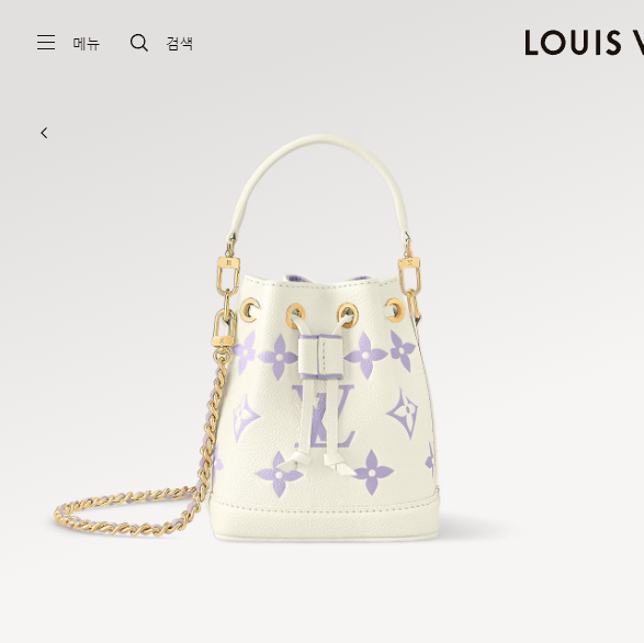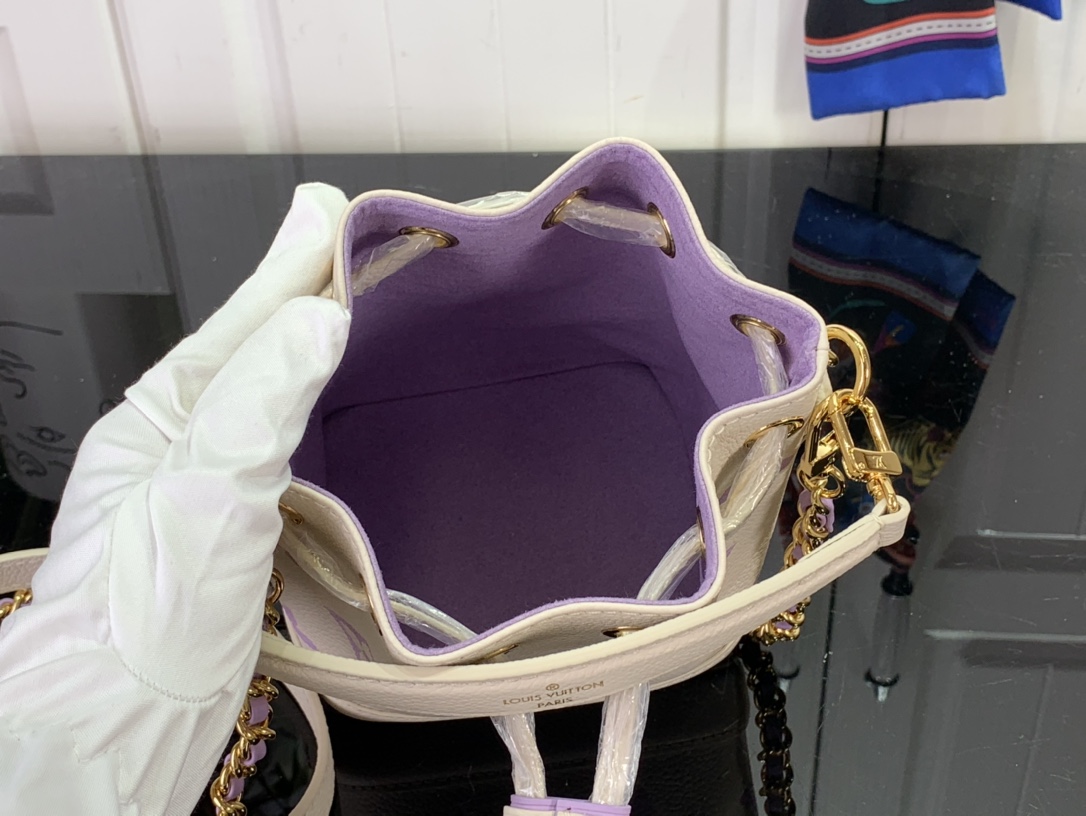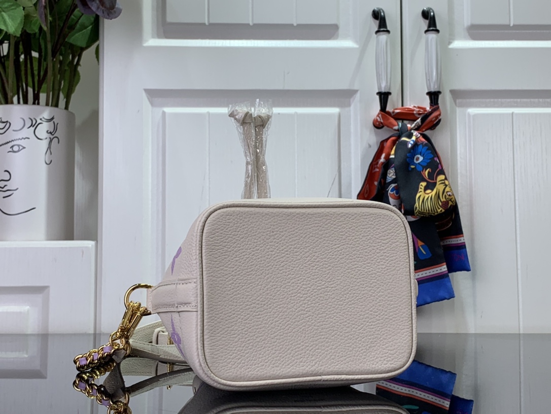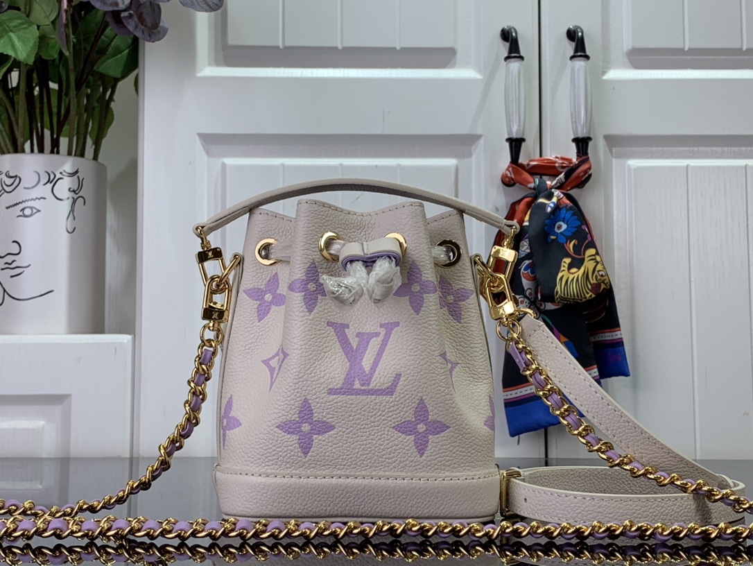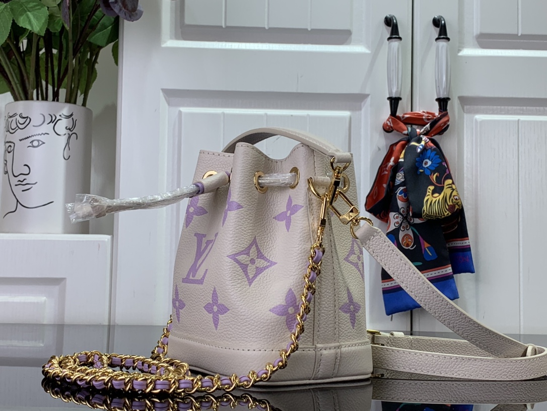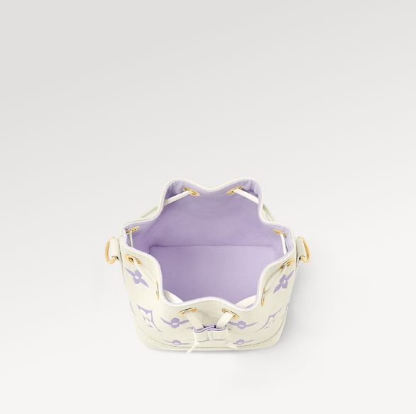 이번 시즌을 맞아 섬세한 바이컬러 색조의 양각 처리한 모노그램 앙프렝뜨 가죽 소재로 선보이는 나노 노에 백. 드로스트링 잠금장치가 특징인 아이코닉한 노에 백의 미니어처 버전. 탈착형 핸들 및 가죽을 엮은 골드 색상의 탈착형 체인을 활용해 다양하게 스타일링할 수 있는 아이템.