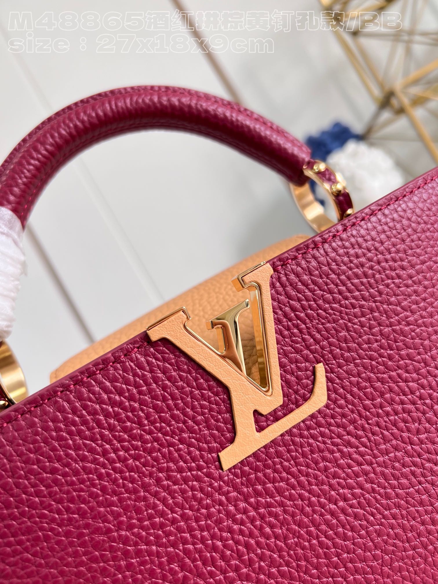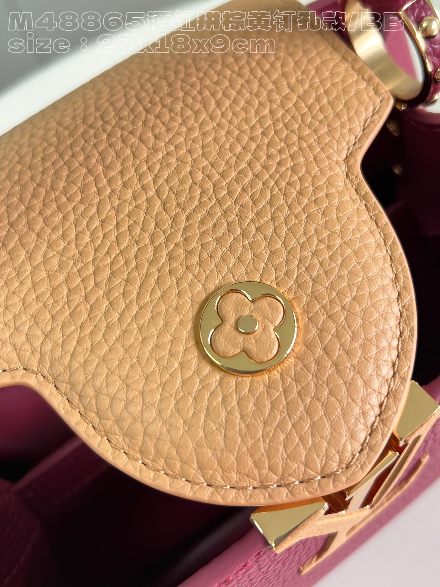 프랑스 수입 송아지 가죽, 반짝이는 금속 장식, 특유의 Capucines 커버가 가방 안에 수납되어 레터링 로고와 함께 모노그램 플라워 패턴을 연출할 수 있습니다.